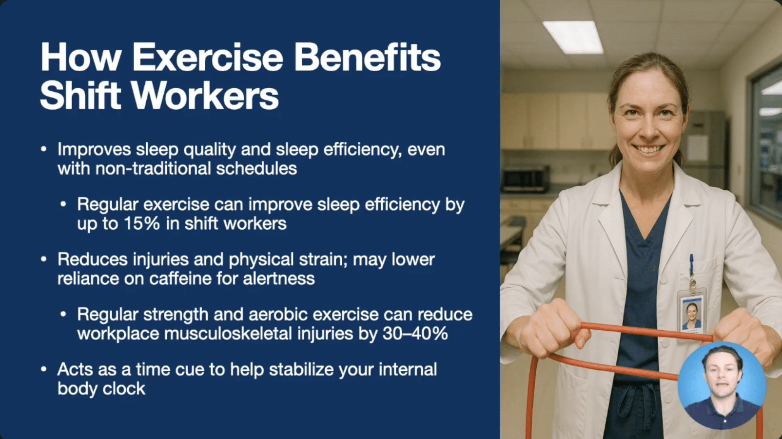Dr. Logan Pendergrst explores the scientific link between regular physical activity and improved health outcomes for those working unconventional hours. He explains how exercise can be as effective as some medications in managing blood sugar and reducing anxiety symptoms by up to 30%. Viewers will learn how consistent movement strengthens the cardiovascular system, leading to more energy during shifts and a 15% improvement in sleep efficiency. Additionally, the segment covers how exercise helps synchronize the body’s internal clock, ultimately protecting you from musculoskeletal injuries and physical strain on the job.
